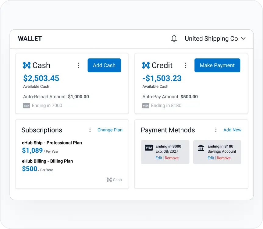 Handle all your shipping transactions from one secure, centralized wallet. Easily manage balances, payment methods, and auto-pay settings while staying on top of every dollar that moves through your operation.