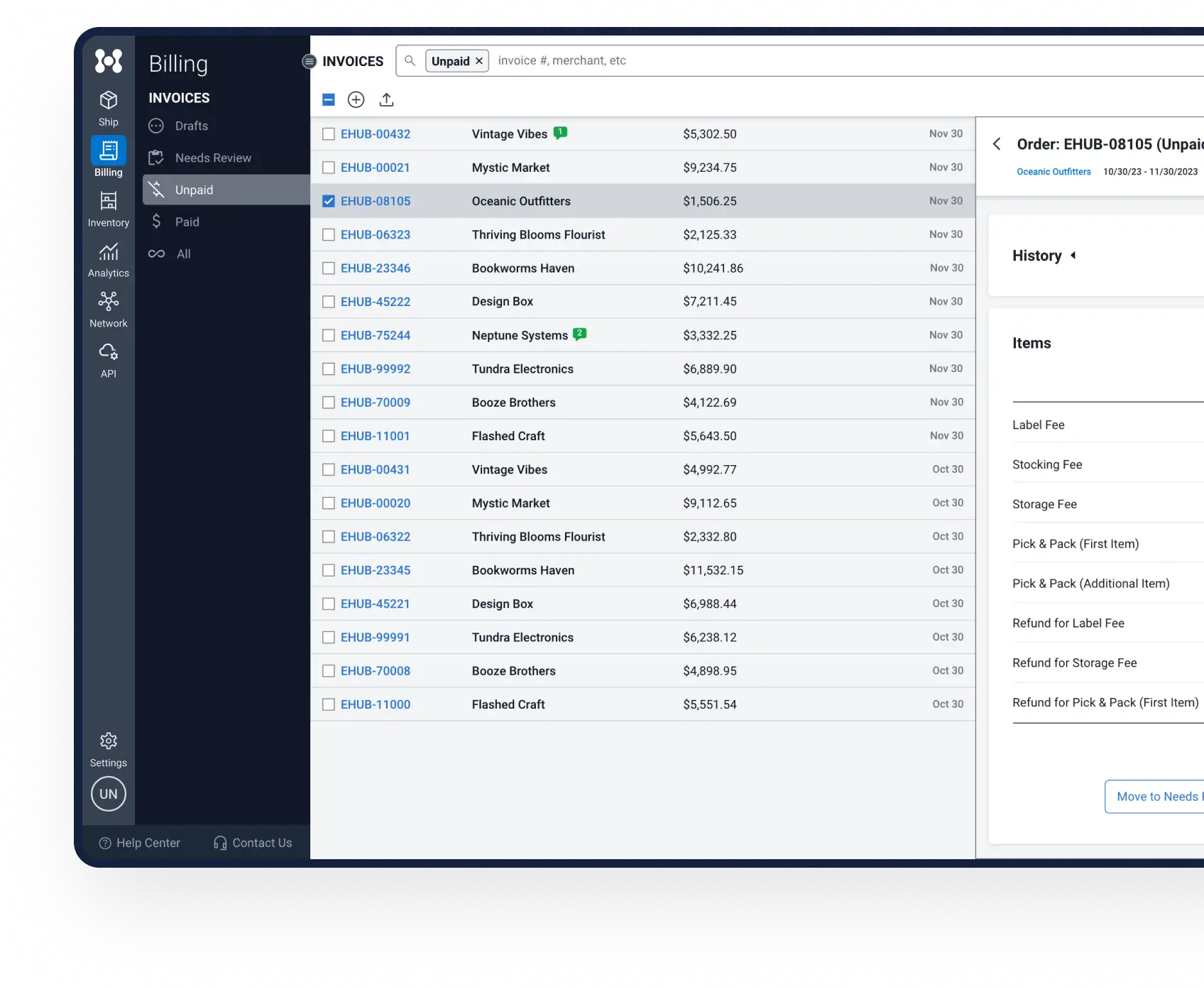 eHub Billing was created for 3PLs to automatically create invoices for clients based on actual shipping activity. As you fulfill orders and ship items, the software automatically tracks costs and generates accurate invoices to save you time and reduce errors.